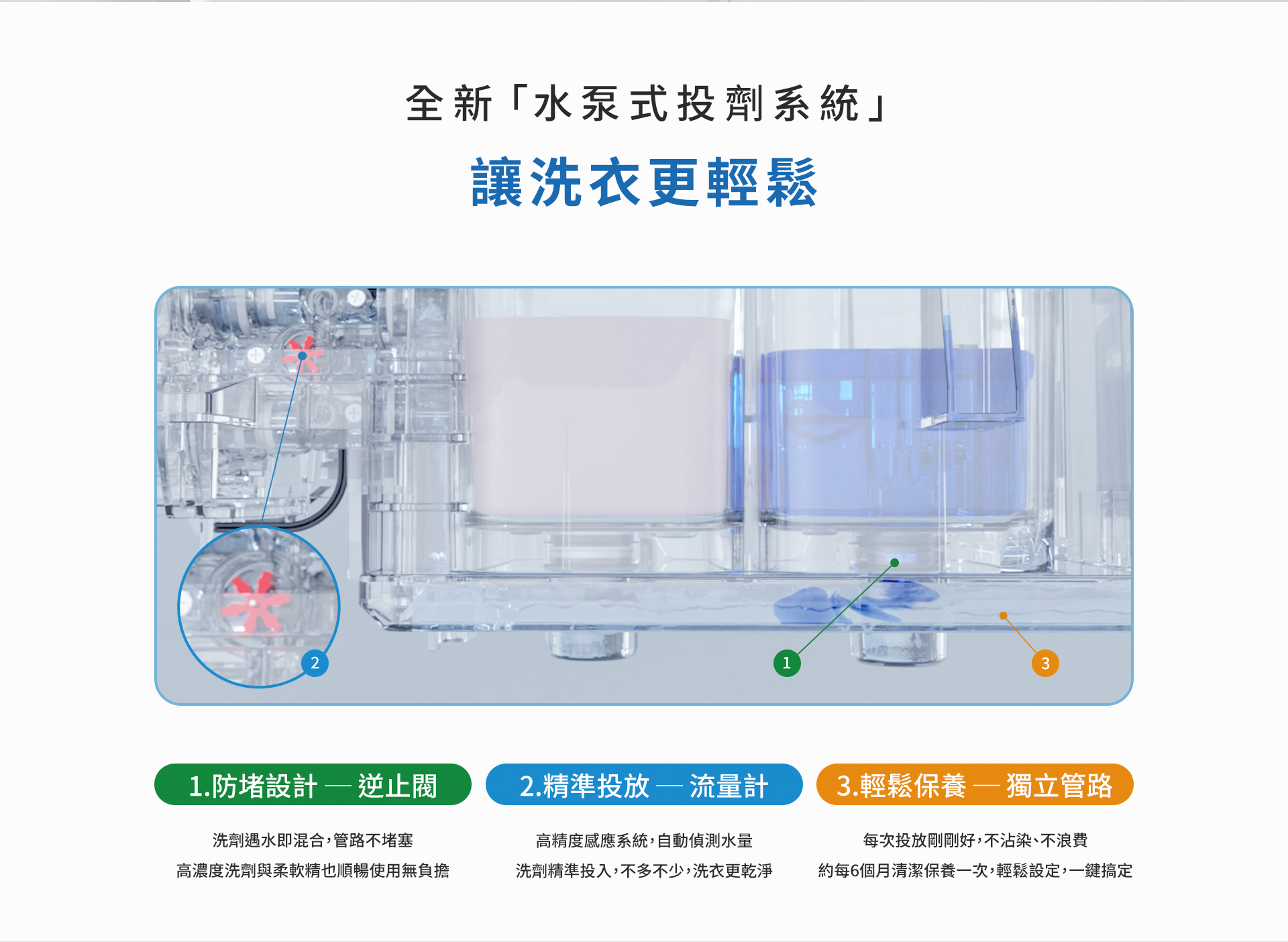 • 日本同步「水泵式投劑技術」洗劑不浪費,不殘留