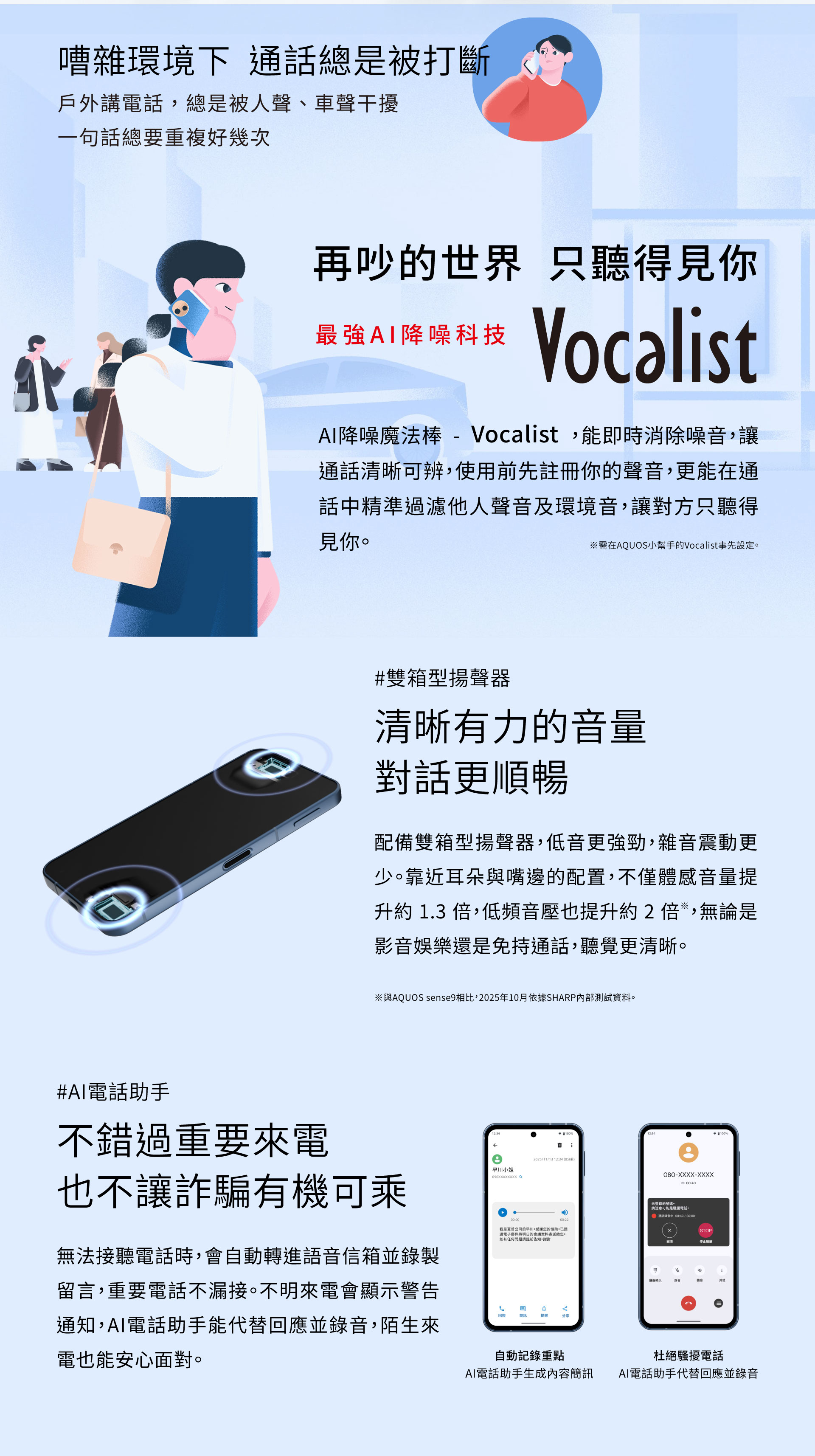 使用者可預先登錄自己的聲音,通話時 AI 將即時識別並濾除環境雜音與他人聲音,讓對方只聽見清晰的本人語音。這項技術讓溝通更自然順暢,帶來「比真實對話更沉浸」的通話體驗。