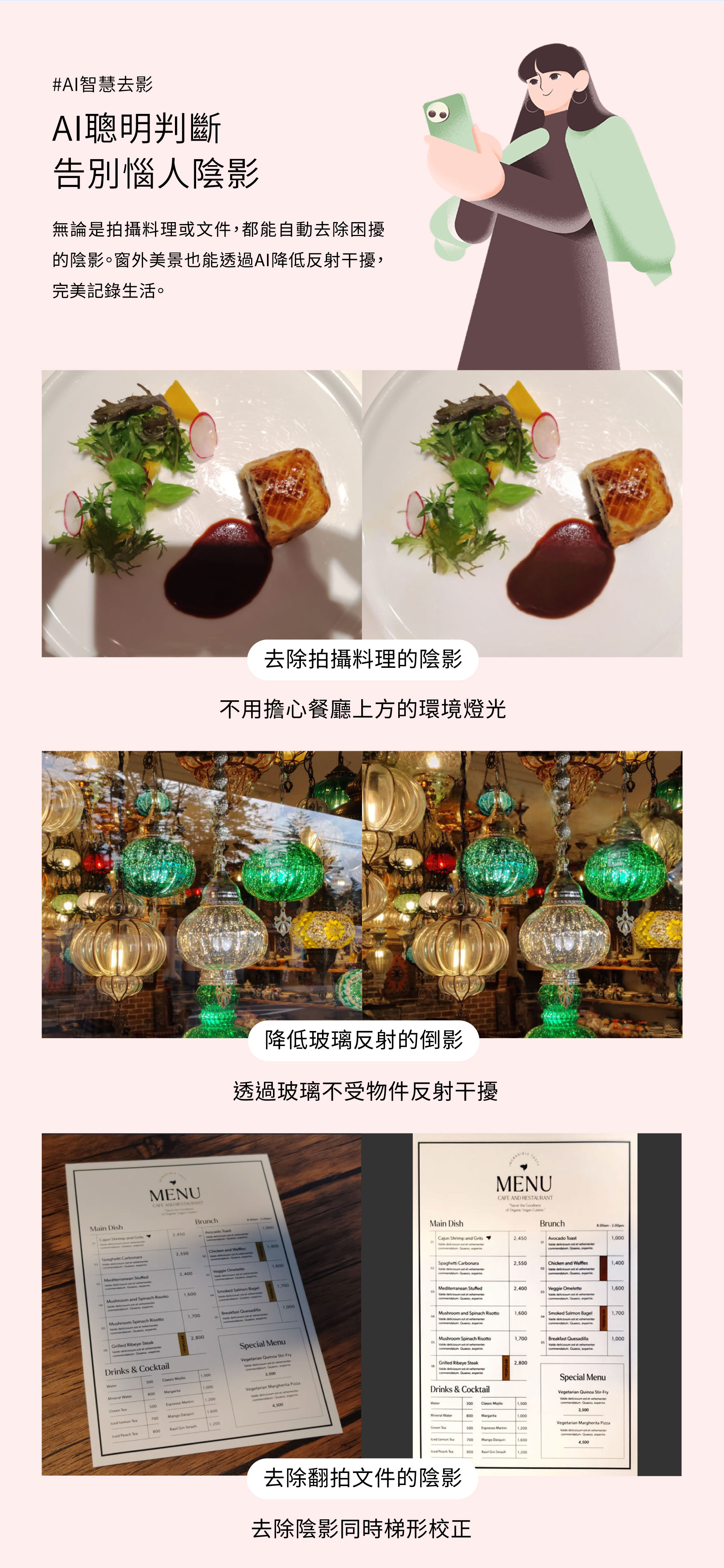 在攝影功能方面,AQUOS sense10承襲高階機種AQUOS R10的AI影像補正技術,能智慧偵測並自動去除拍攝畫面中的陰影,讓影像更乾淨自然。除了原有的「去除料理陰影模式」與「去除文件陰影模式」外,全新加入 「去除反射倒影模式」,可在透過玻璃拍攝時,自動降低反射,清晰捕捉展示品細節。同時支援AI影像合成運算技術,在變焦拍攝或夜景模式下,也能忠實重現細節與層次,從特寫到超廣角皆能輕鬆拍出高畫質影像。此外,搭載全新通話AI功能「Vocalist(AI降噪魔法棒)」。