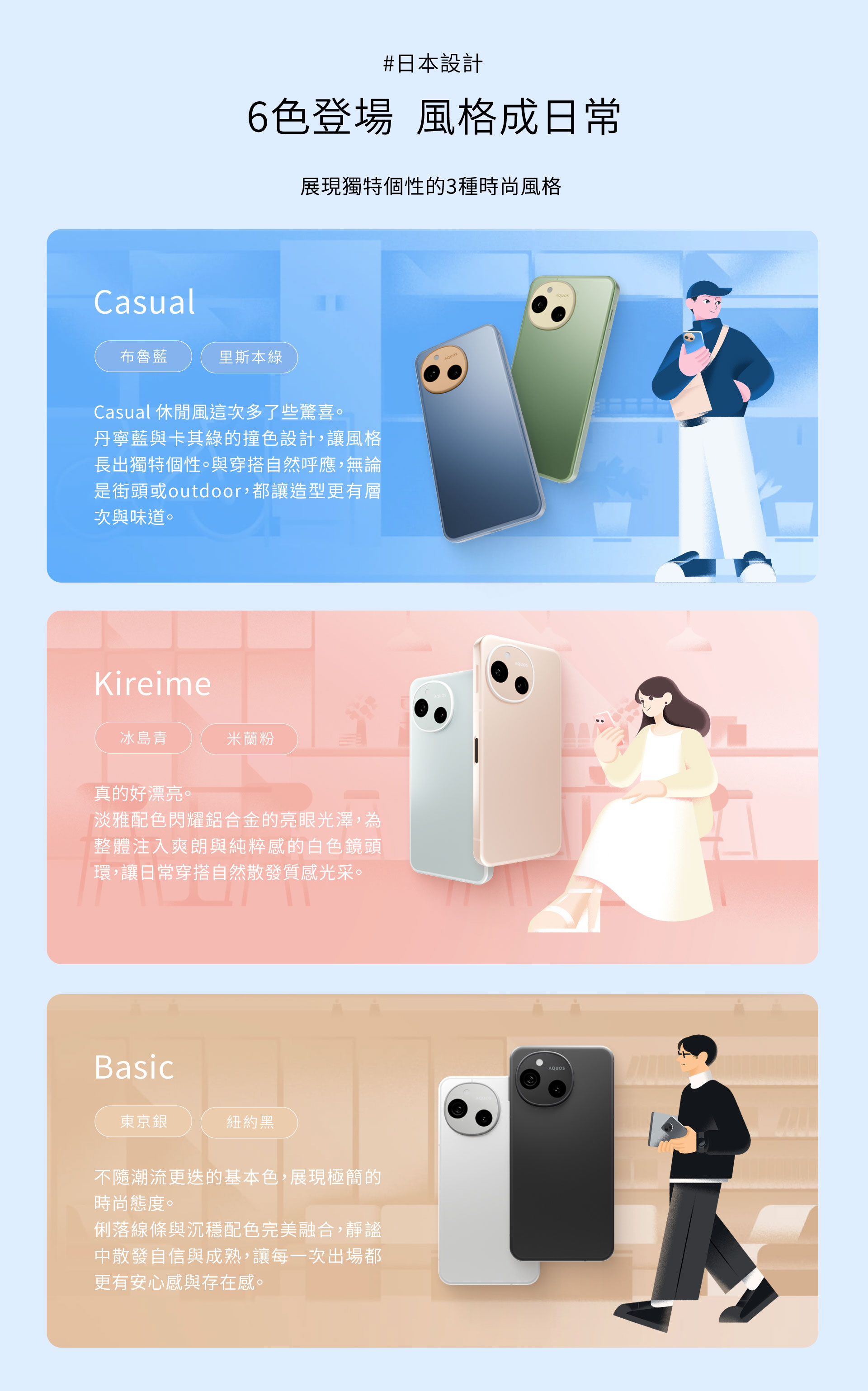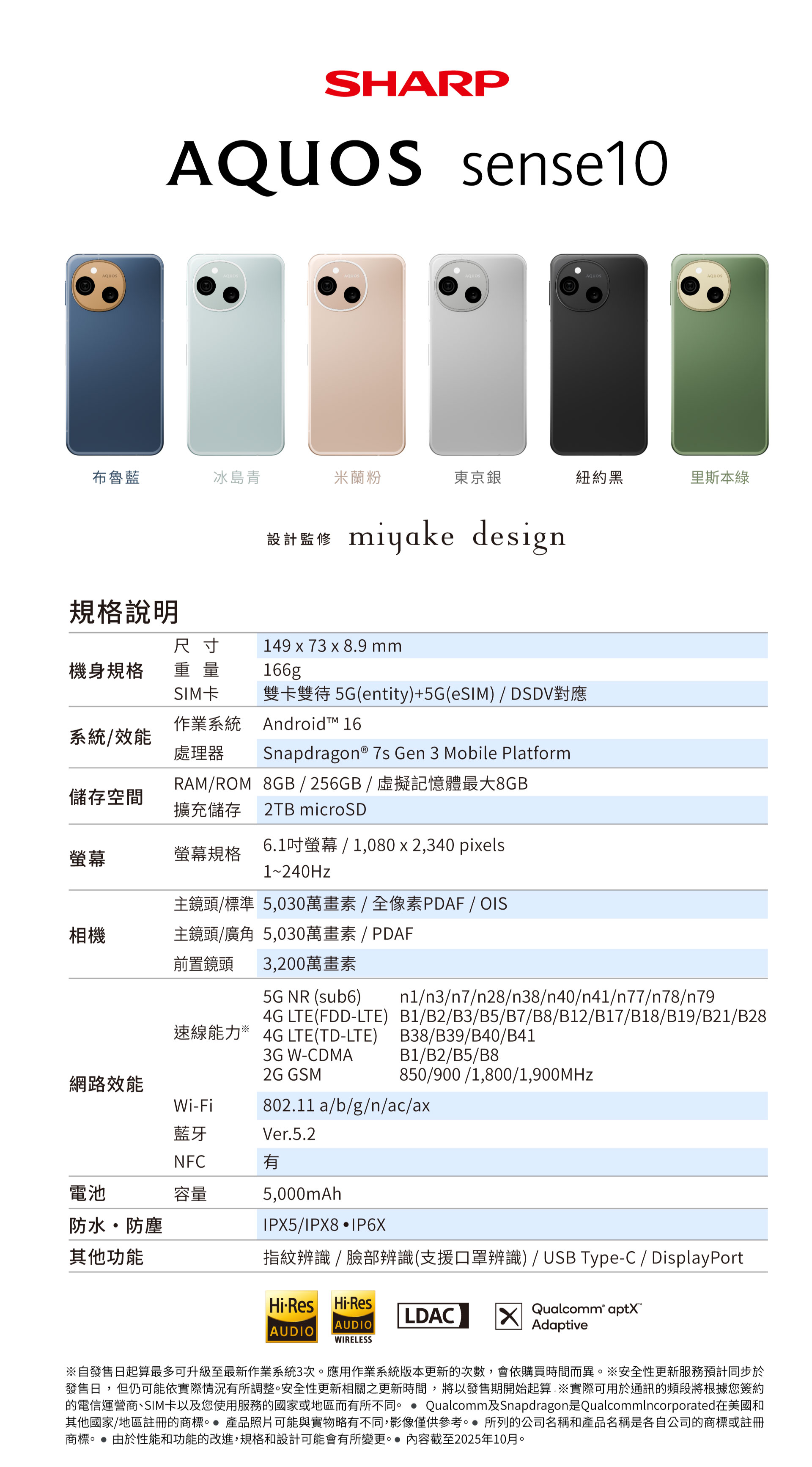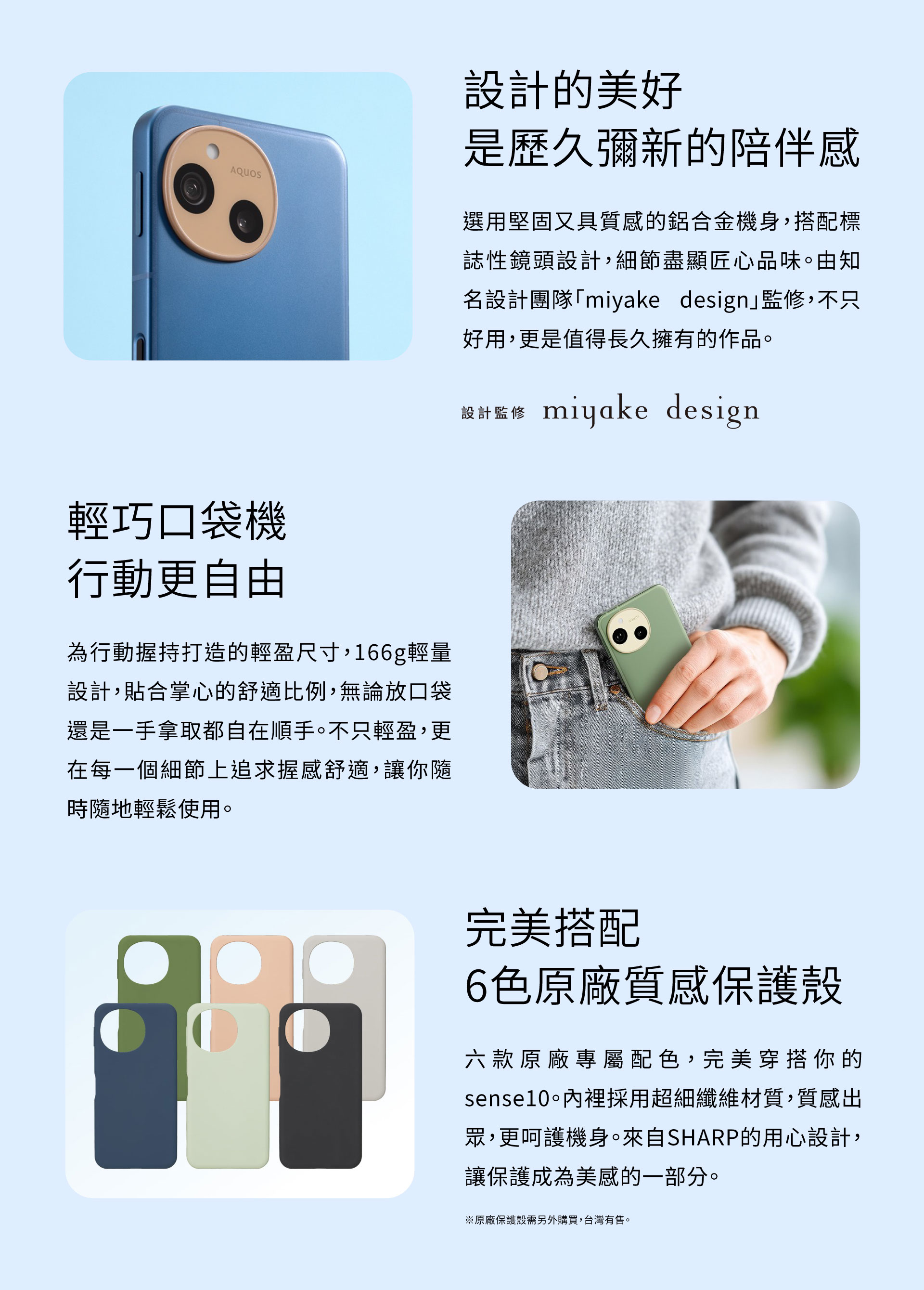 AQUOS sense10提供六種以時尚為靈感的機身色彩:布魯藍、里斯本綠、米蘭粉、冰島青、紐約黑、東京銀。