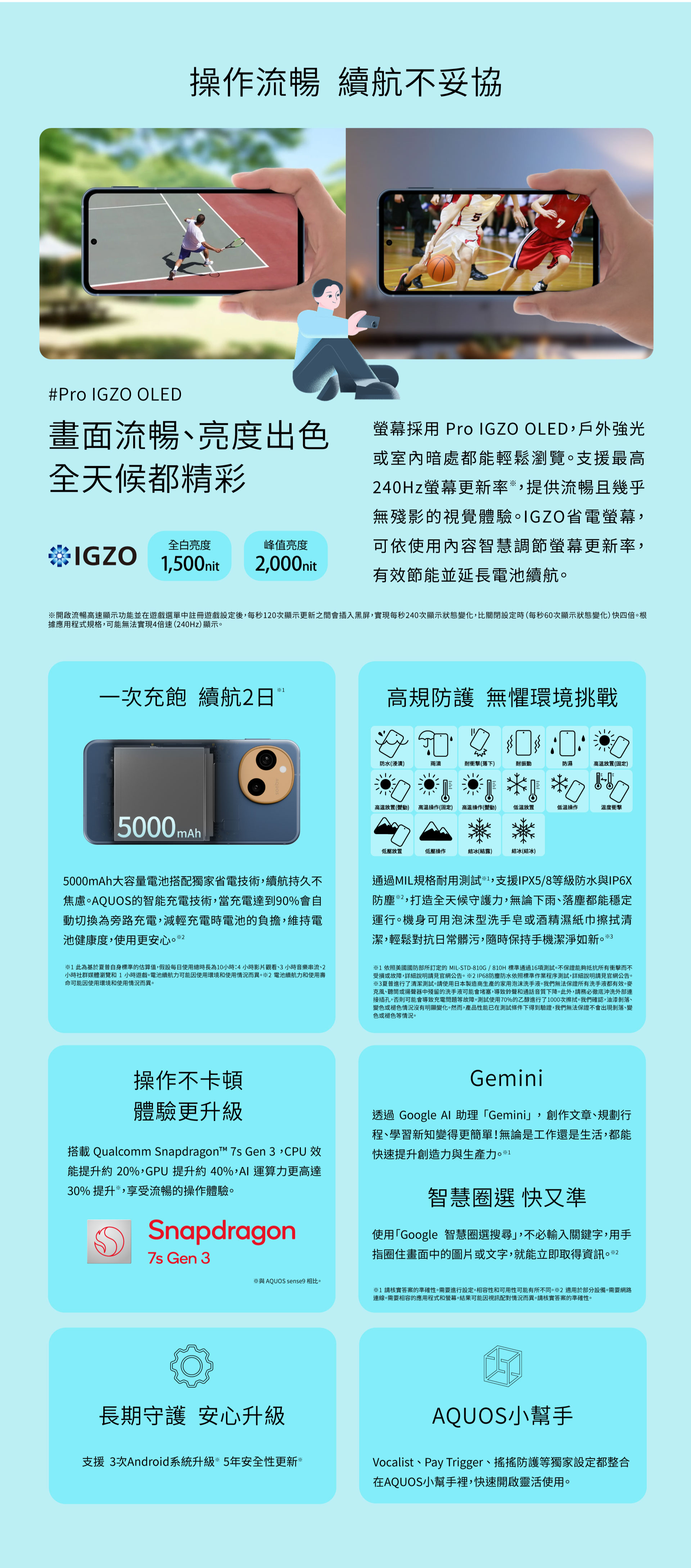 AQUOS sense10 採用高效能處理器 Snapdragon® 7s Gen 3 Mobile Platform,與前一代機種相比,CPU效能提升約20%、GPU效能提升約40%、AI效能提升約30%。